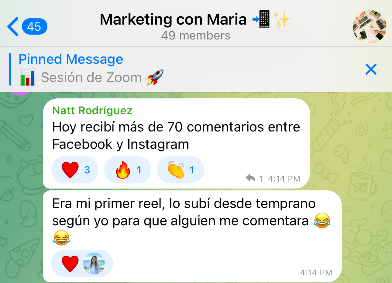 Tendrás acceso a mi chat privado en Telegram para apoyo diario y a llamadas grupales por Zoom una vez a la semana.